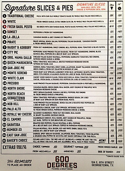 Larry and Henry are on the road again. First stop is 600 Degrees Pizzeria in Georgetown Texas. 24 taps of craft beers. Larry had a 512 Pecan Porter. Only one as he is the driver. Henry had Mirror Pond Pale Ale. Beers were served good and cold. Too bad it’s lunchtime with many more miles to go today. Pizza is available by the slice or whole pie.We ordered 2 slices. The first slice was the Pirate (genoa salami, pepperoni, italian sausage, canadian bacon, and fresh garlic). The meats were plentiful and bursting with flavor and perfectly cooked for maximum wow. We only wish that the sausage would have been under the sliced meats so that it didn’t roll off. The second slice was the El Camino (charbroiled chicken, real bacon, pineapple, fresh cut basil, and hot sauce). This pizza was all over the place. Every bite tasted different depending on the mix of ingredients. All bites were outstanding. One of the most flavorful pizzas we have ever tasted. The crust was good, although a little soft at the point. After eating about 1/3 with a knife and fork, we were able to pick the pizza up without it flopping. Pizza was served on a pizza pan with a paper lining. Knife and fork does not well on paper. The crust was like a baguette. Good chew and flavor. In and out for about $25 plus tip. Great deal for great pizza.